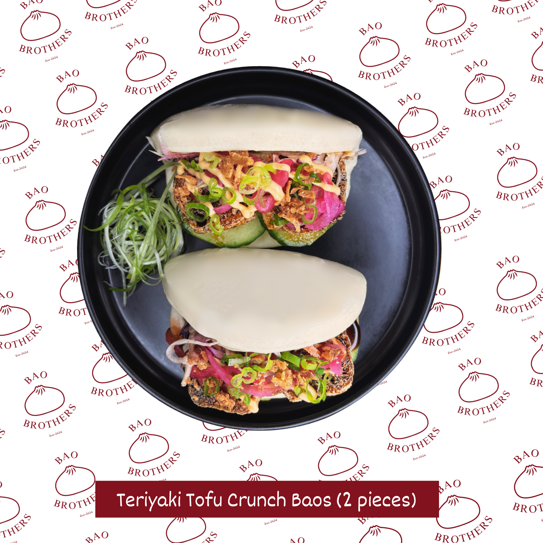 Two soft, fluffy bao buns filled with crispy golden tofu glazed in a rich teriyaki sauce. Layered with fresh cucumber, crunchy red cabbage, pickled onions, and a sprinkle of crispy fried onions for added texture. Drizzled with a creamy sesame mayo, these baos are a perfect balance of sweet, savoury, and crunchy flavours.